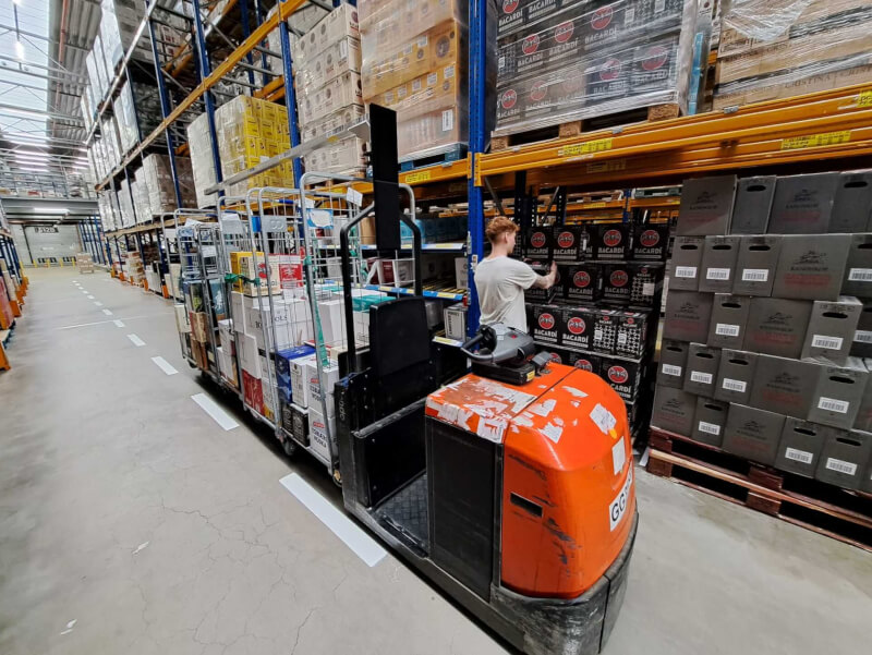 Met een lepelaar (elektrische pallettruck) rijd je door het magazijn en vul je de karren met dozen die de winkels hebben besteld.